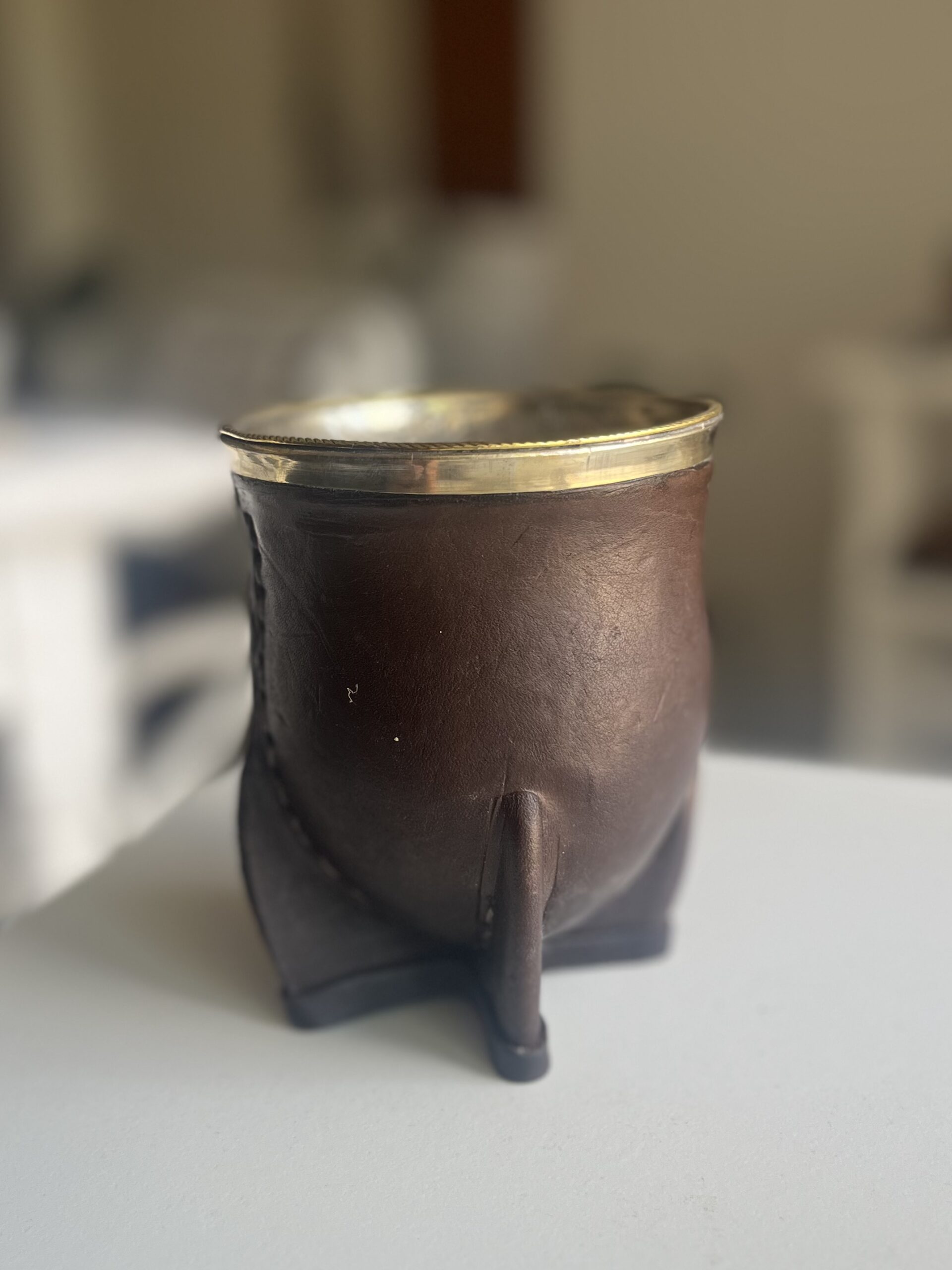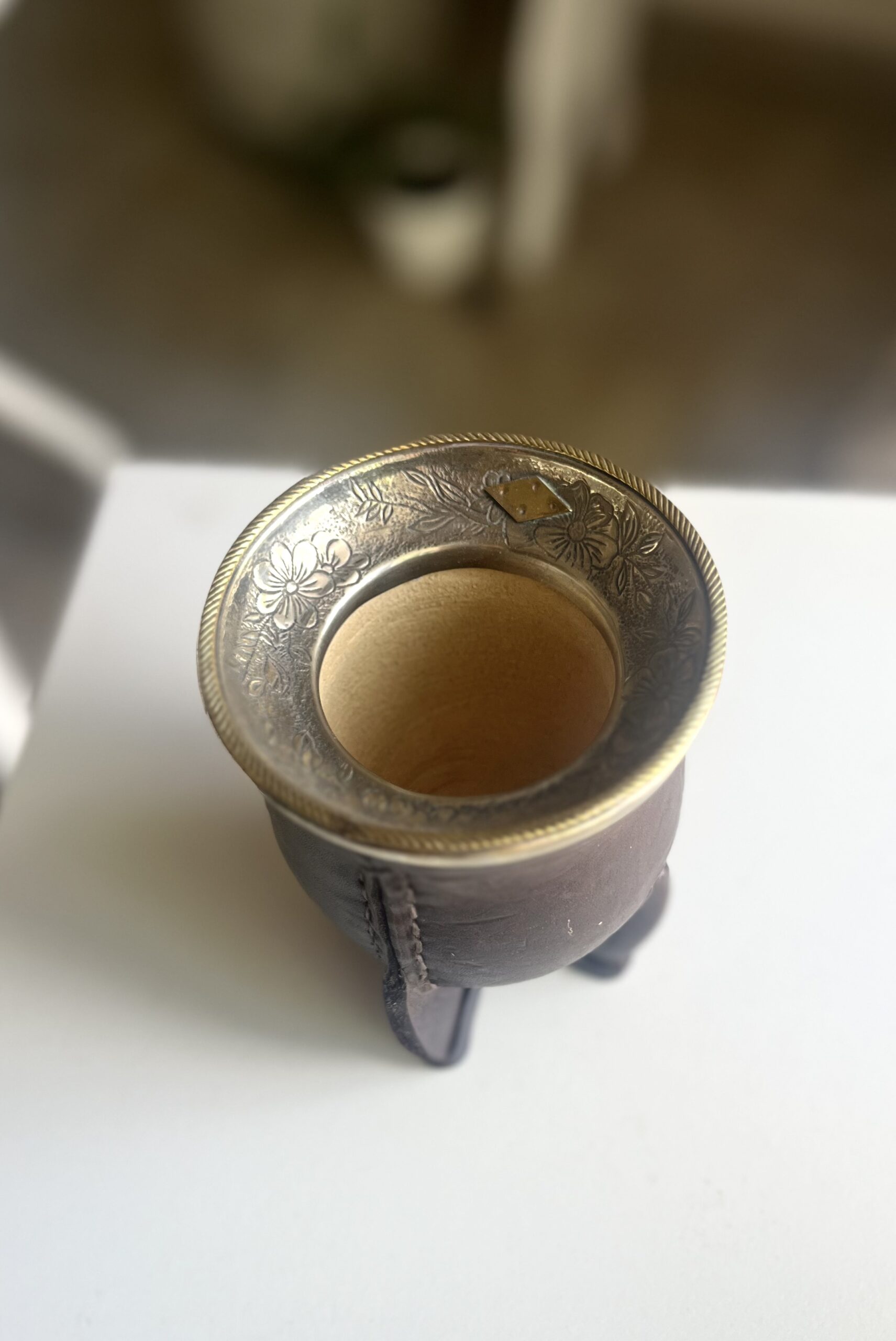 Se trata de un mate camionero de calabaza forrado en cuero marrón, con virola de alpaca cincelada al lacre invertida y anillo de bronce, combinando resistencia, tradición y un acabado artesanal refinado. Cada detalle está pensado para resaltar la belleza natural de la calabaza y el trabajo artesanal, haciendo de este mate una pieza exclusiva y elegante.