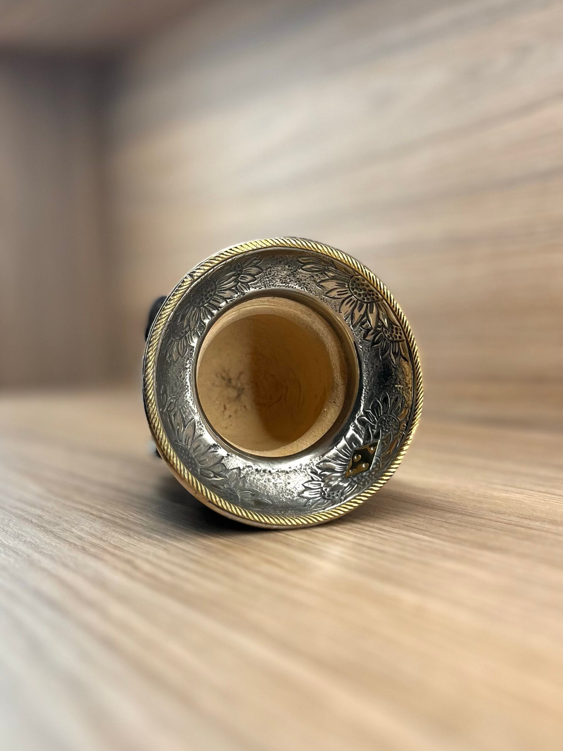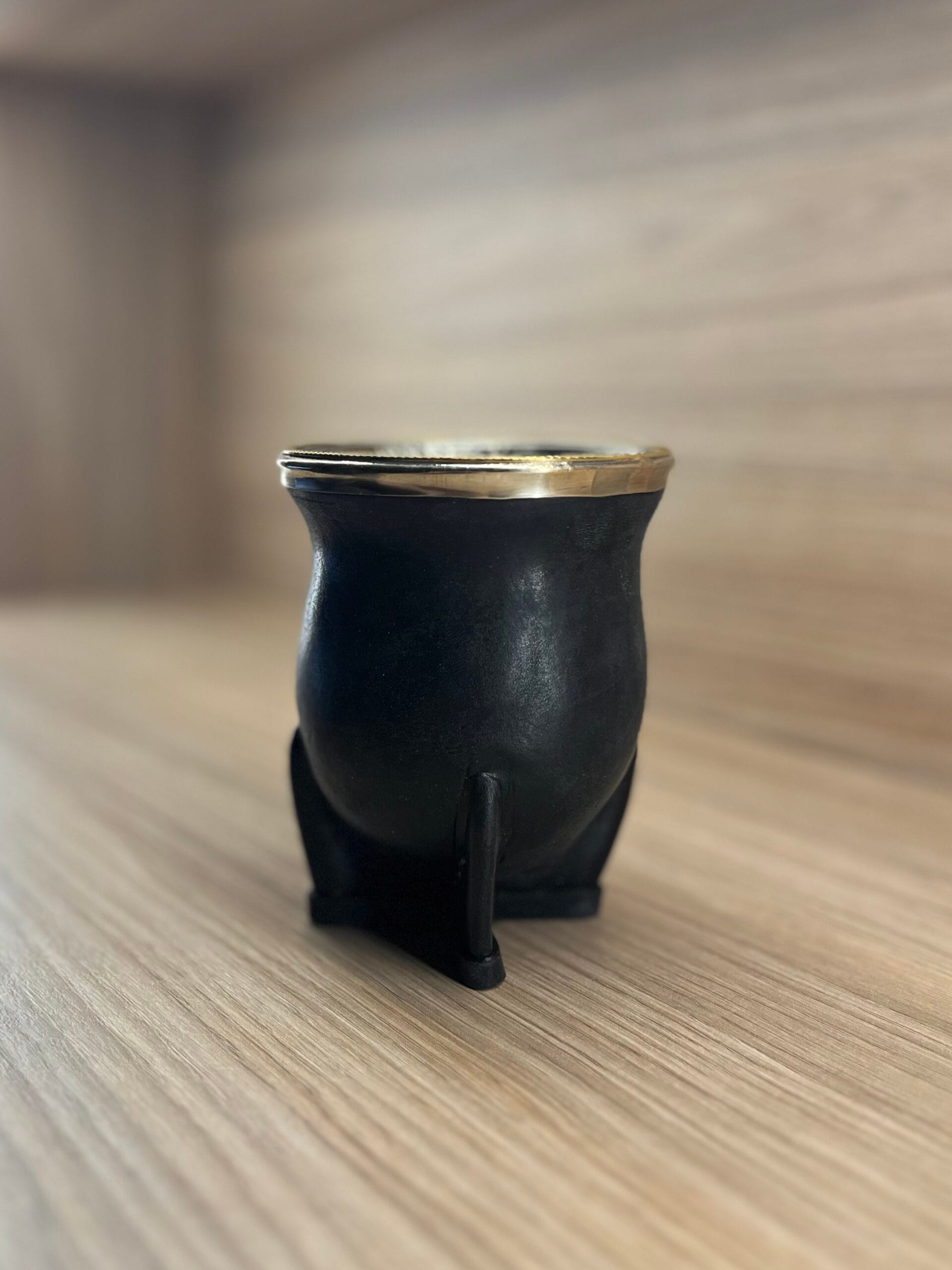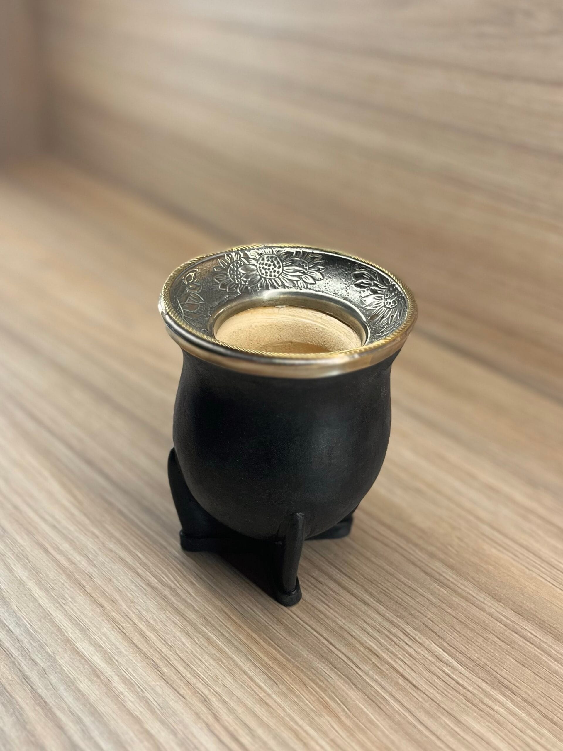 Se trata de un mate camionero de calabaza forrado en cuero negro, con virola de alpaca cincelada al lacre invertida y anillo de bronce, combinando resistencia, tradición y un acabado artesanal refinado. Cada detalle está pensado para resaltar la belleza natural de la calabaza y el trabajo artesanal, haciendo de este mate una pieza exclusiva y elegante.
