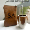 Yerbera de cuero gamuzado de 360 g, personalizable con tus iniciales grabadas o con el diseño que vos quieras.