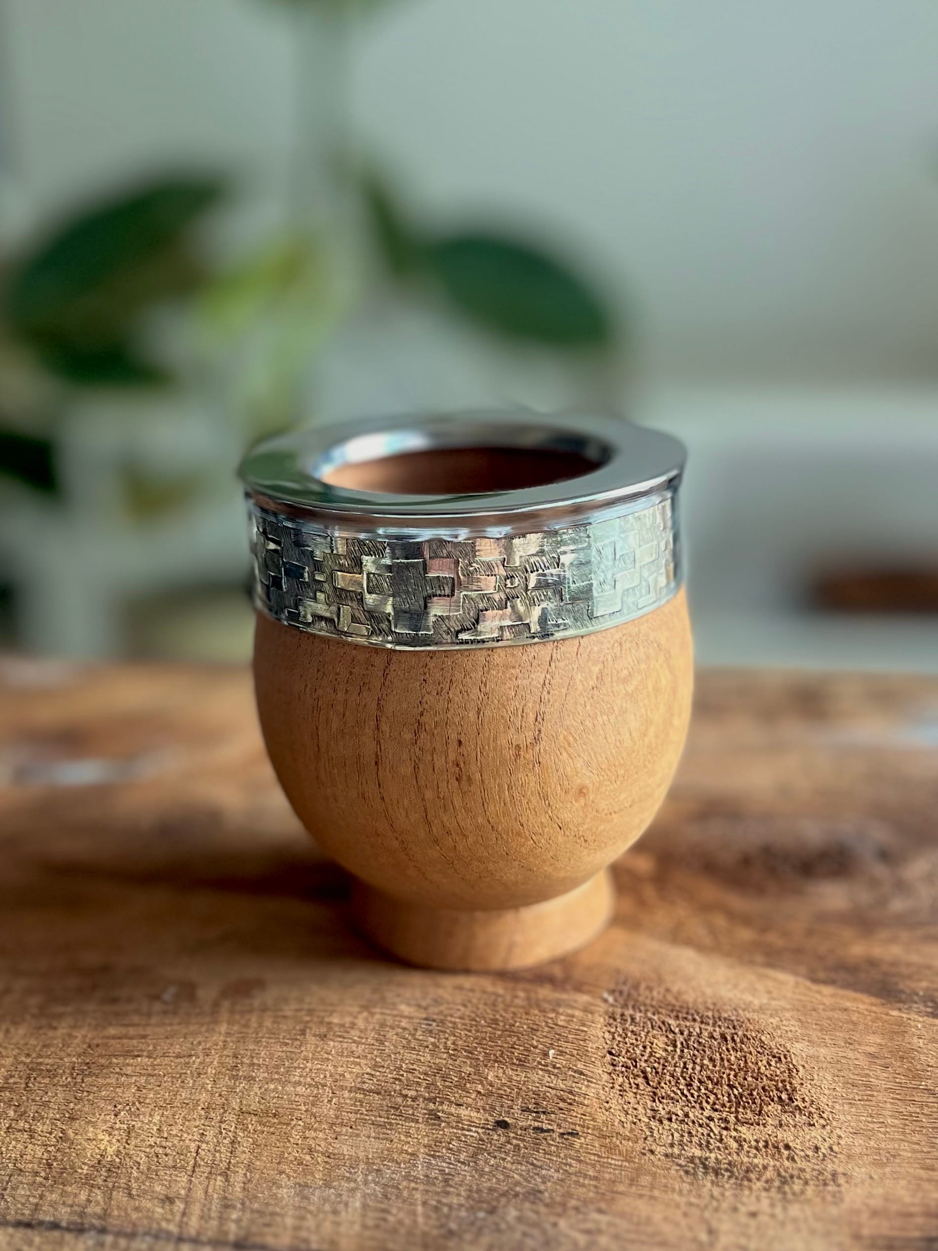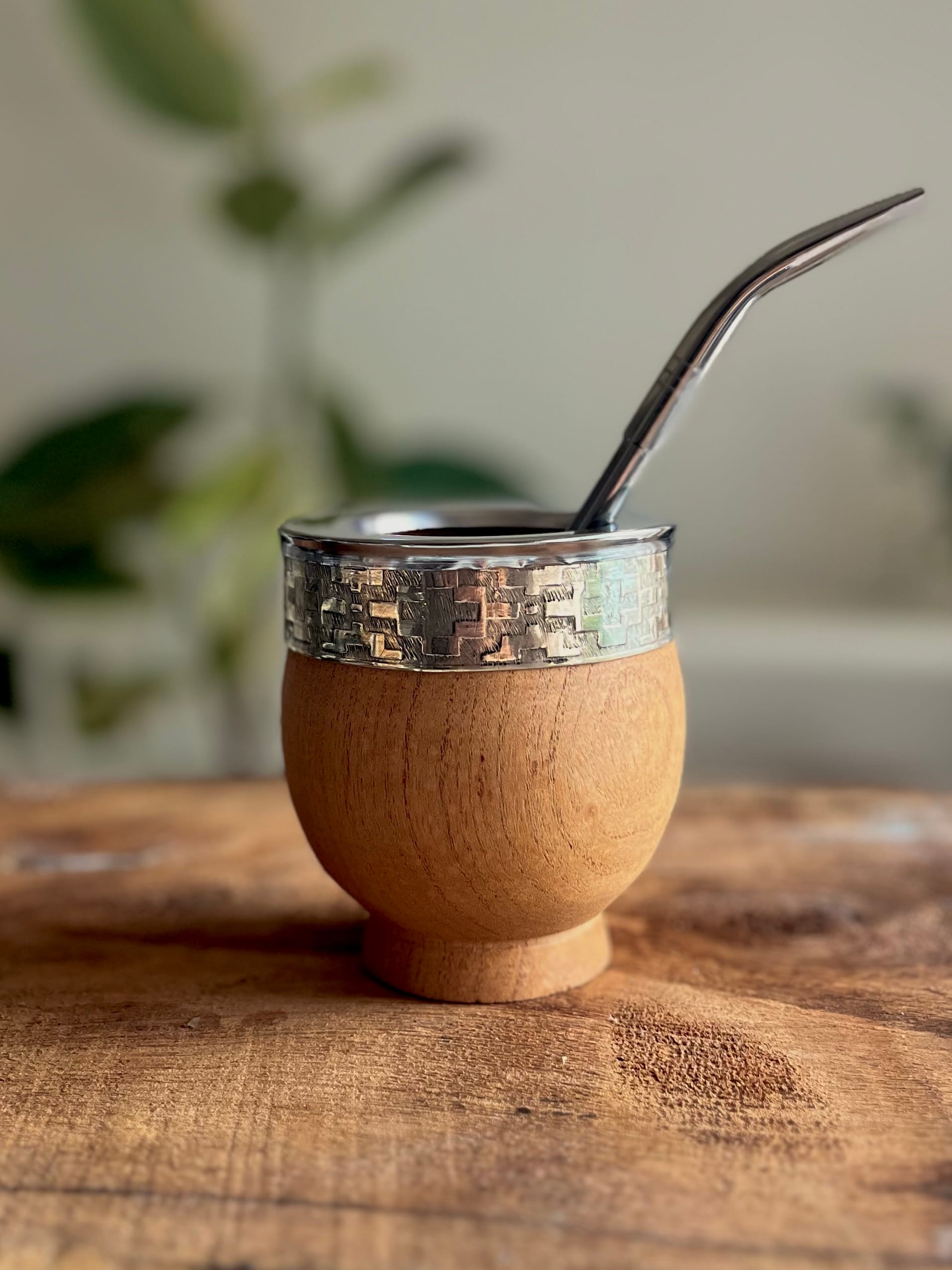 Material y acabado: Mate artesanal tallado en madera de algarrobo, sin tratamiento de cera, con un aspecto más rústico y natural. Fleje y virola de alpaca, que aportan firmeza, detalle y una terminación uniforme en tonos metálicos.