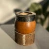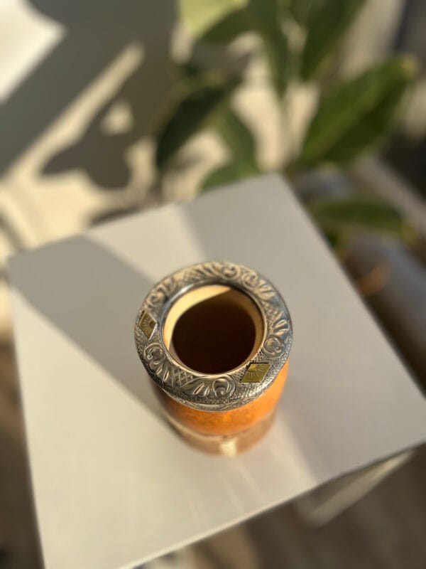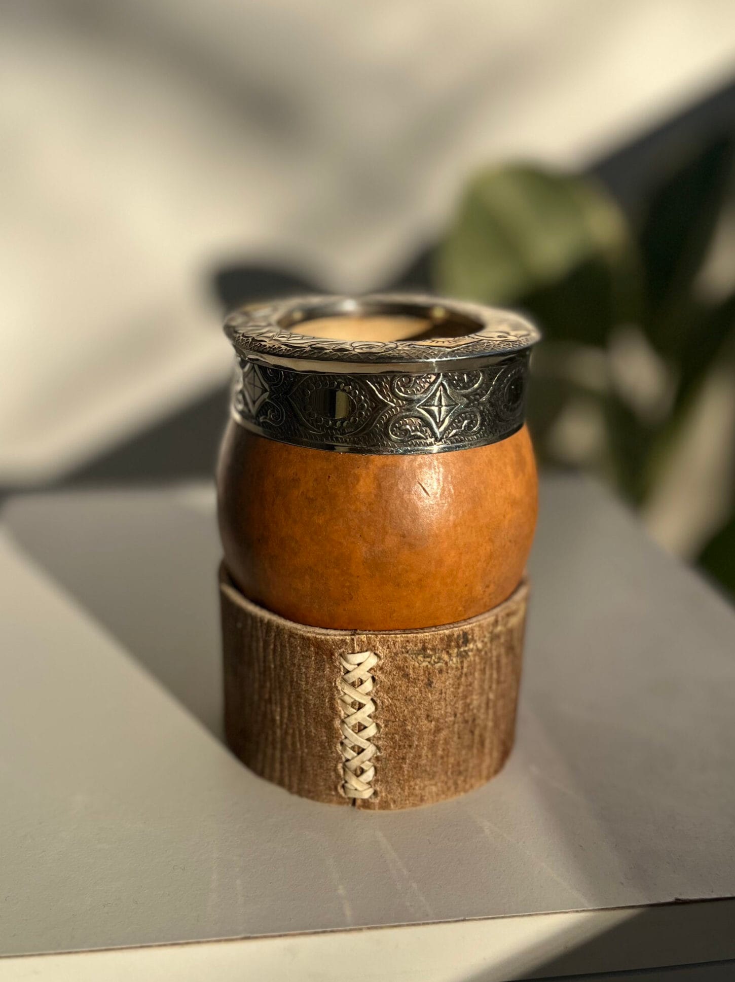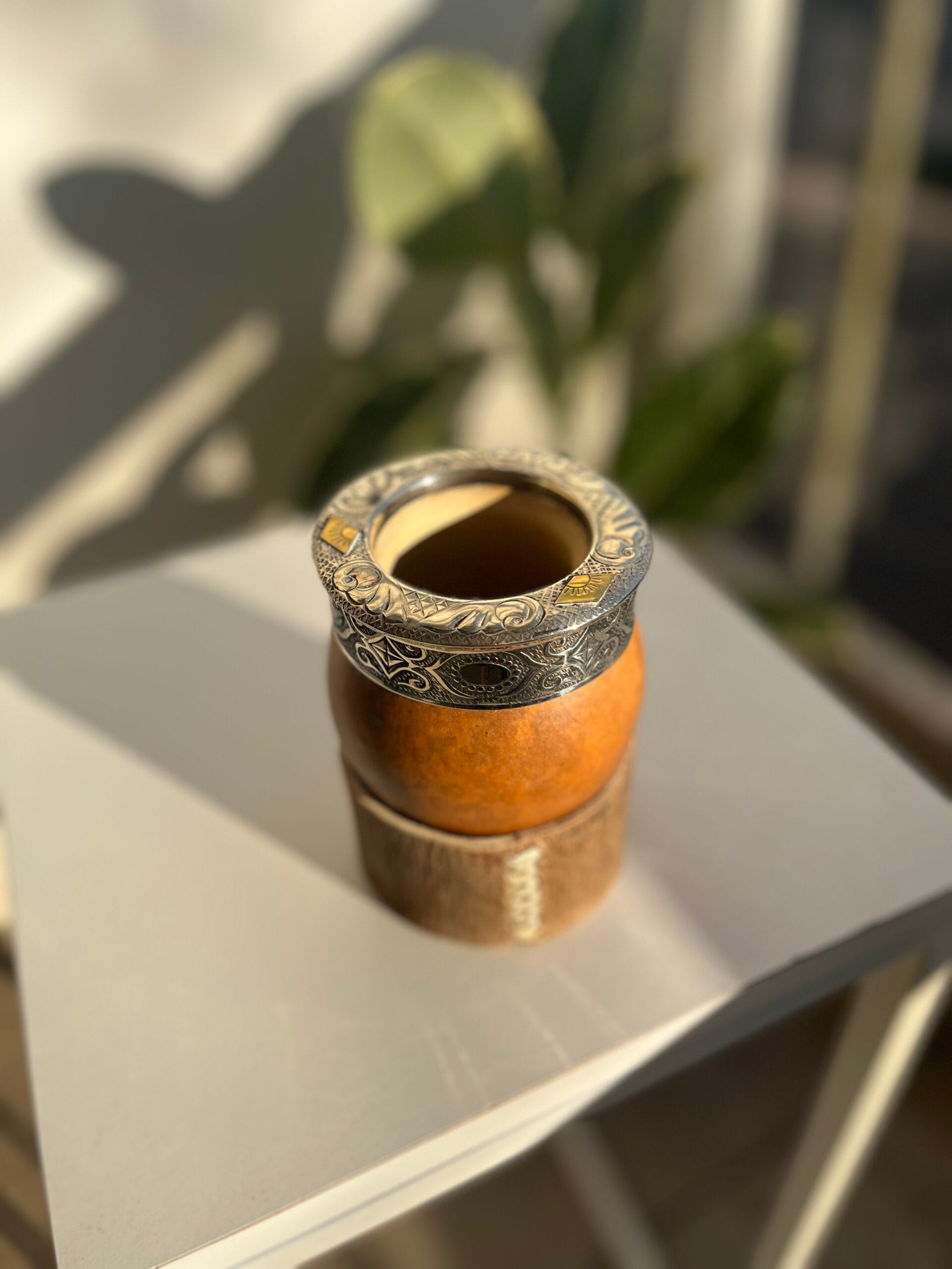 En este caso se trata de un mate modelo imperial de calabaza pulida, con base de cuero cosida con tiento, virola cincelada y fleje de alpaca que aportan un detalle distintivo y elegante. Un trabajo artesanal que realza cada parte del mate y lo convierte en una pieza única.