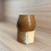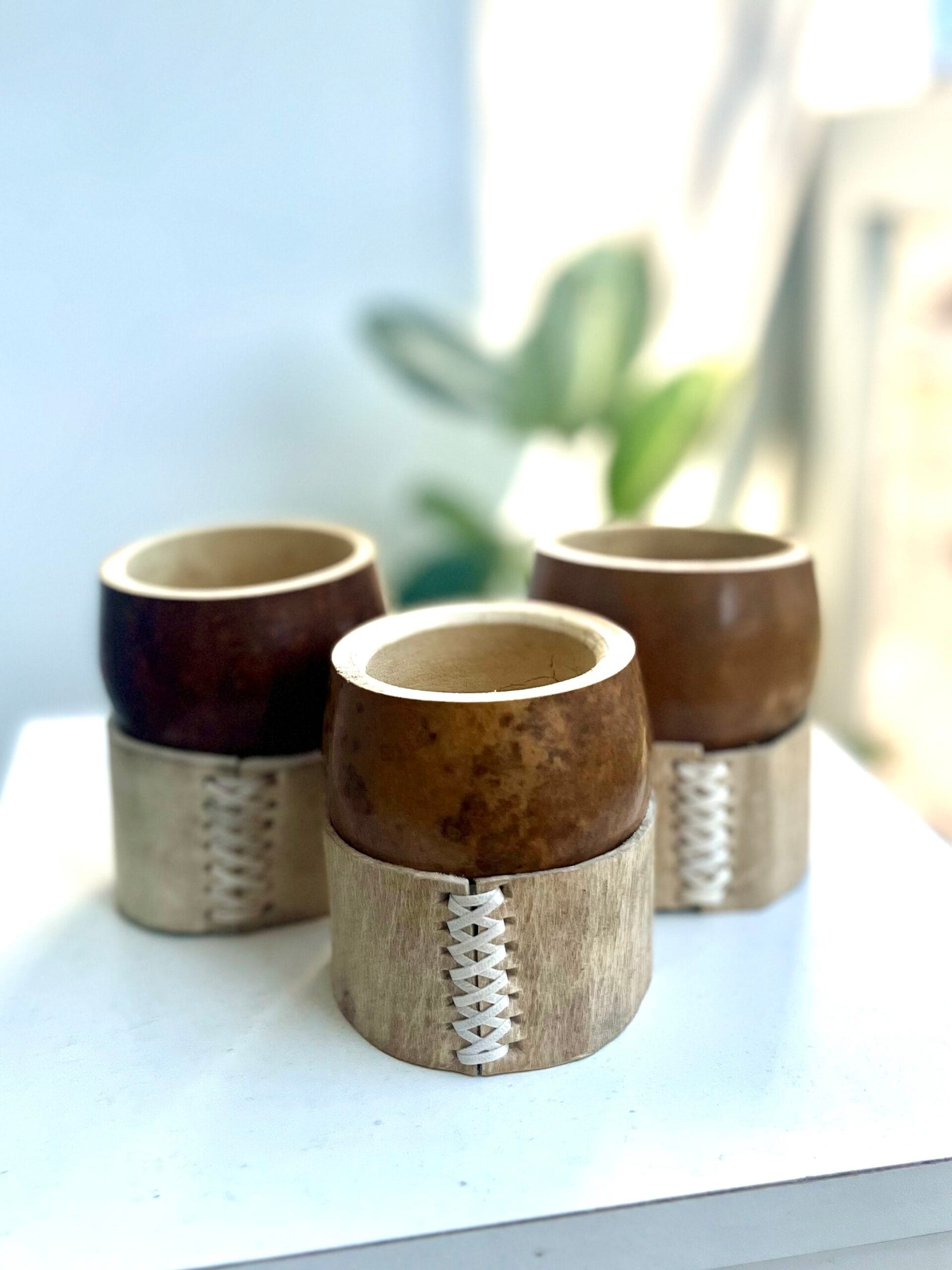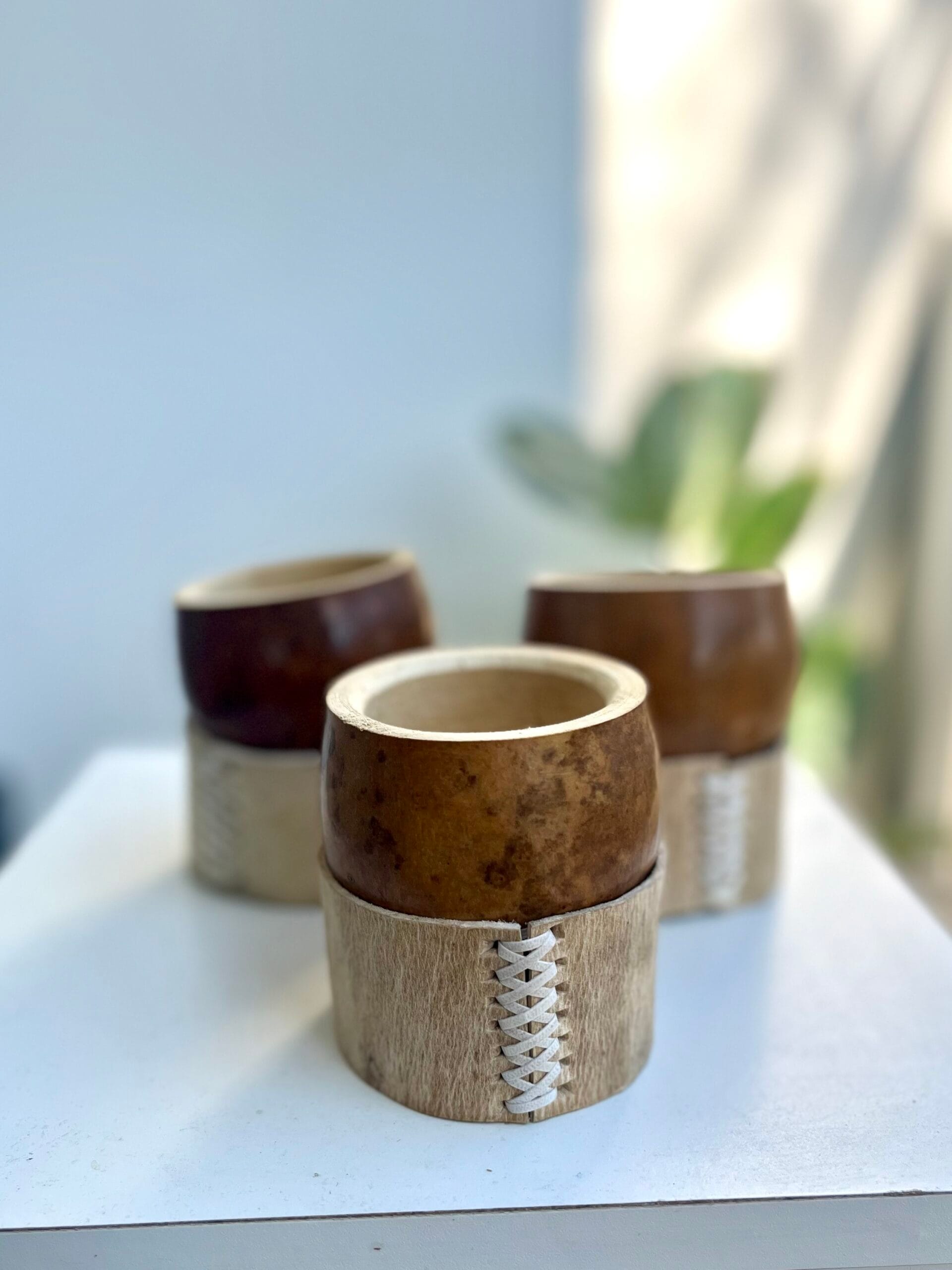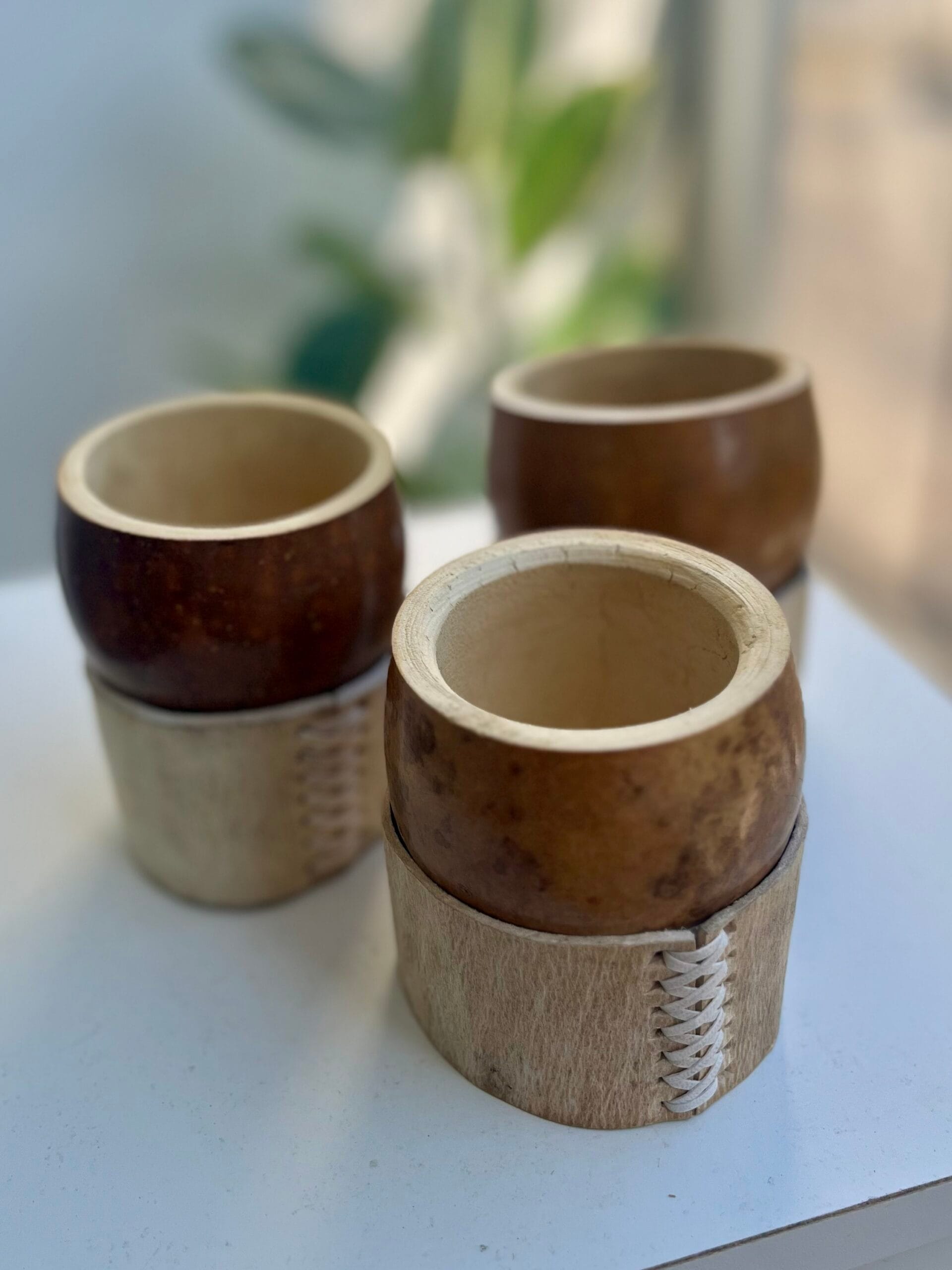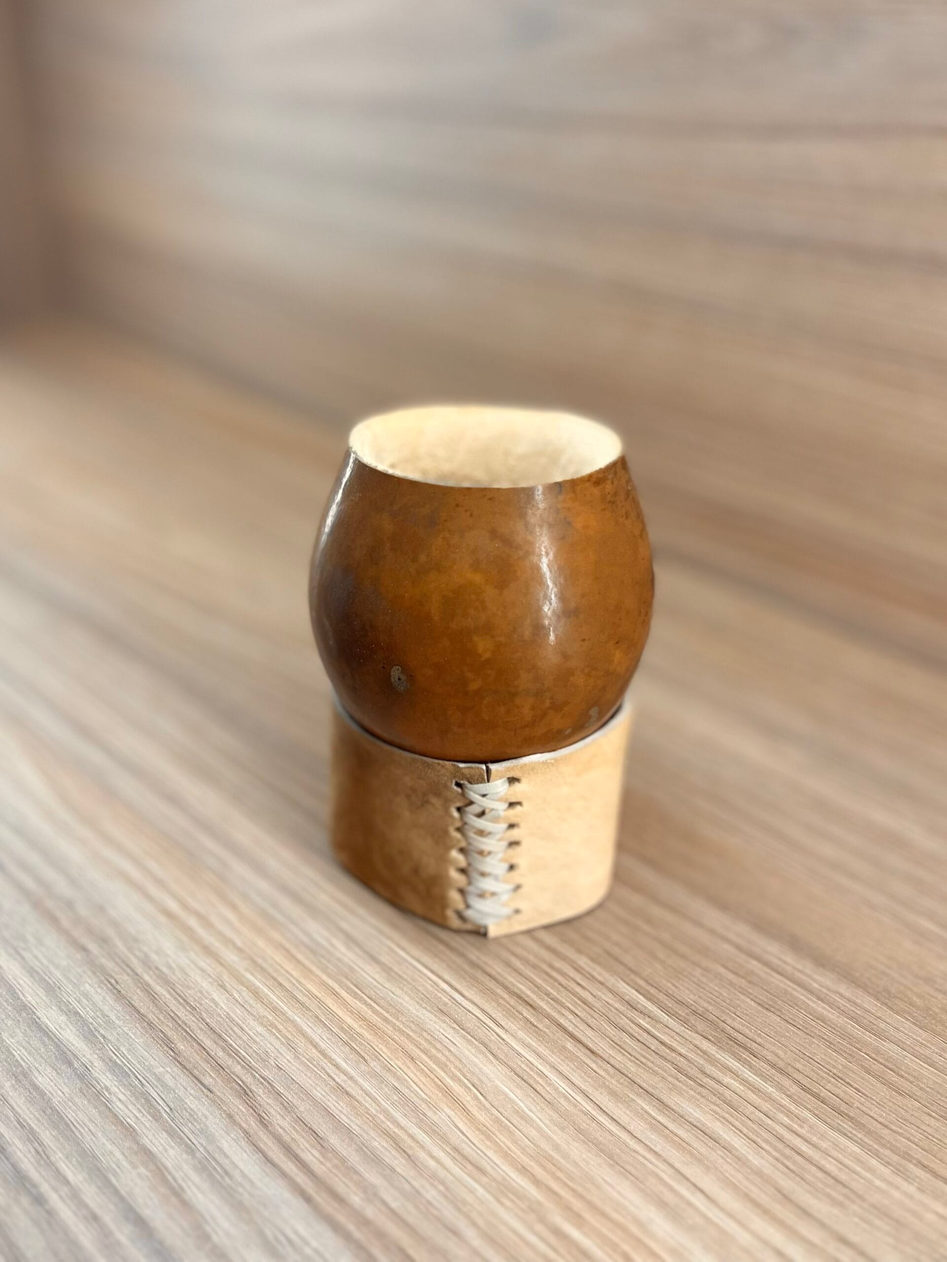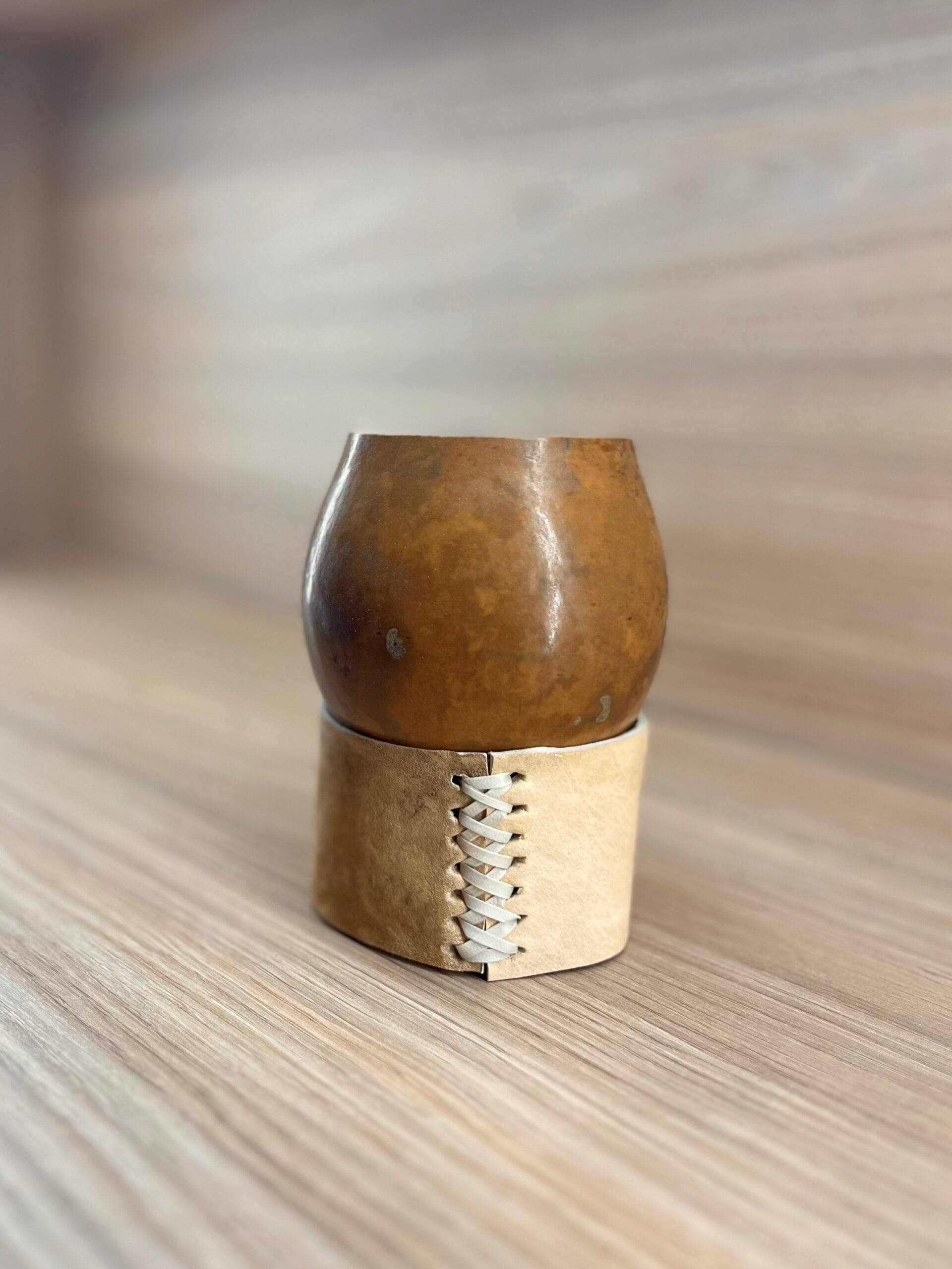 Tiene base de cuero cocida al tiento, detalle clásico de los mates criollos.