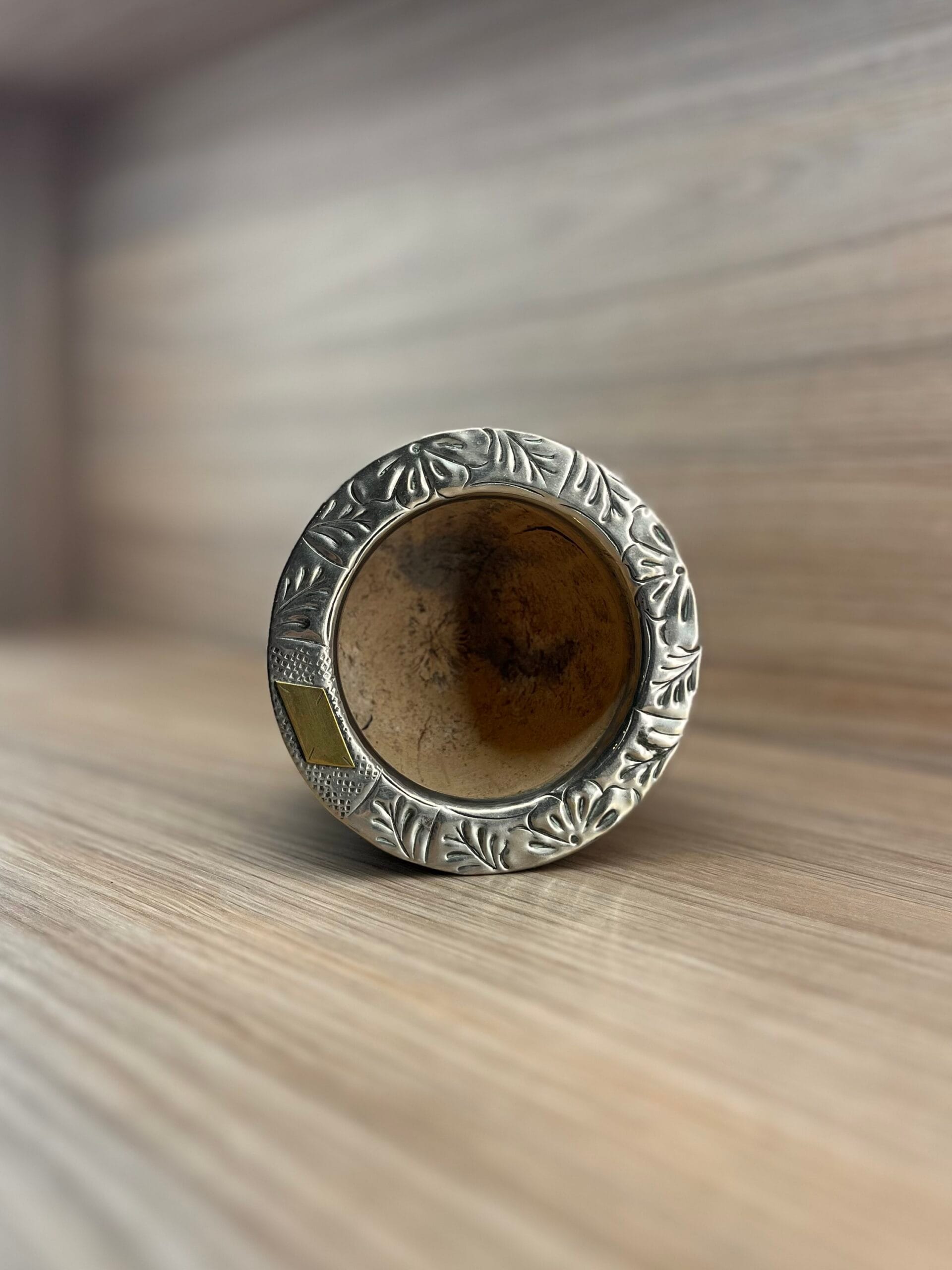 En este caso se trata de un mate modelo imperial de calabaza forrado en cuero, con virola cincelada y flejes de alpaca que realzan su diseño artesanal y le dan un estilo distinguido. Un trabajo cuidado en cada detalle, pensado para quienes buscan un mate único y elegante.