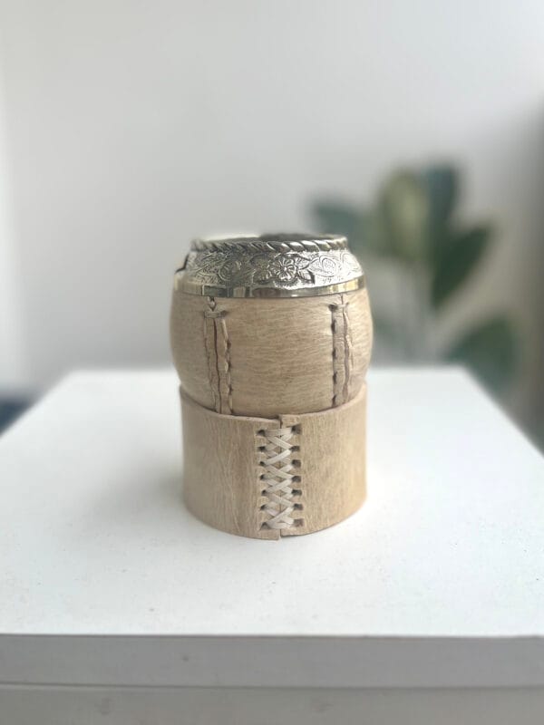 Se trata de un torpedo forrado en cuero crudo tipo bolita, con cincelado realizado al lacre. La base de cuero crudo cosida al tiento completa el diseño, combinando tradición, resistencia y estilo en cada terminación.