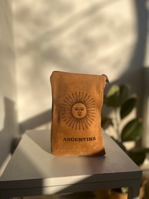 Un accesorio clásico y funcional para acompañar tus mateadas. Esta yerbera está confeccionada en cuero gamuzado, con cierre superior que asegura la yerba y permite un uso cómodo y práctico. El diseño se realza con el grabado del Sol de Mayo, un detalle distintivo que aporta identidad y tradición argentina.
